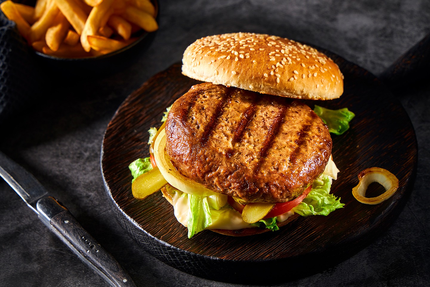Λαχταριστό μπιφτέκι από φρέσκο κιμά μοσχάρι Black Angus που έχει μορφοποιηθεί σε δισκοειδές σχήμα.